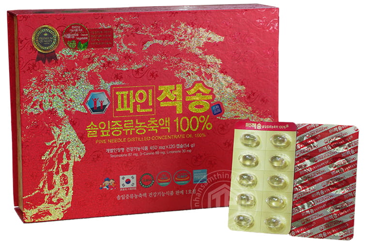 Viên tinh dầu thông đỏ Chính Phủ Hàn Quốc cao cấp Pine Jeok Song Gold 120 viên được chiết xuất từ 100% lá cây thông đỏ Hàn Quốc loại A, giúp chăm sóc sức khỏe, đặc biệt hỗ trợ giảm lượng đường trong máu, mỡ máu, gan nhiễm mỡ, đau dây thần kinh, thần kinh tọa, viêm đại tràng và ruột.