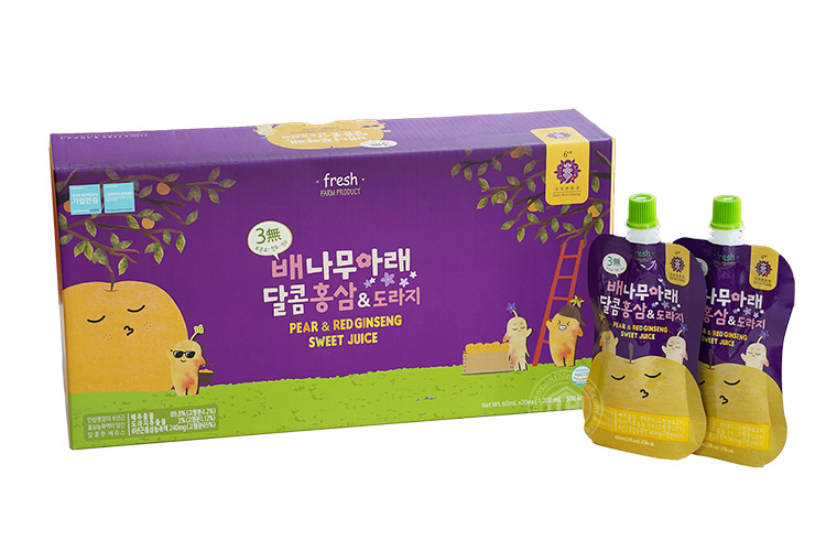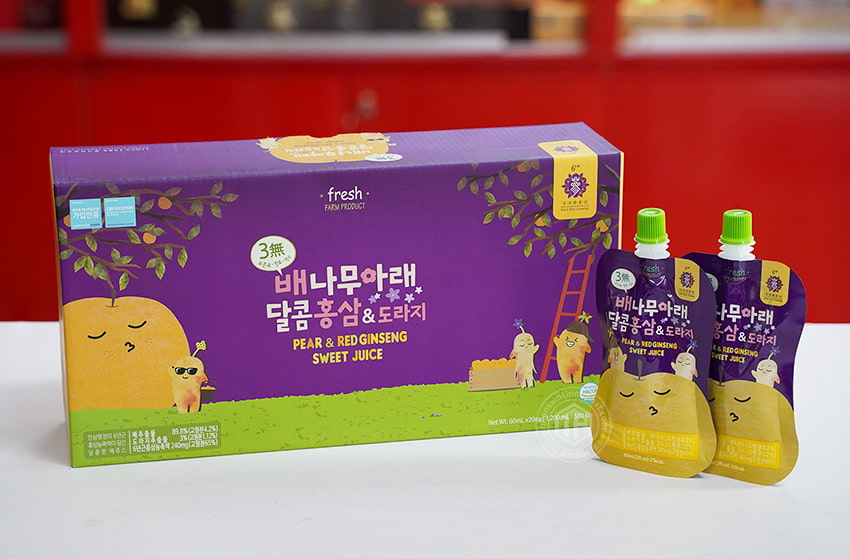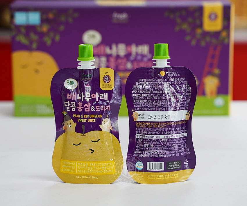 • Hỗn hợp cô đặc nước lê (Hàn Quốc, thành phần chất rắn 4.2%, quả lê GAP) 89.8%, hỗn hợp cô đặc hoa chuông (Hàn Quốc, thành phần chất rắn 1.12%) 3%, đường hữu cơ 6.7%, hỗn hợp hồng sâm cô đặc (Hàn Quốc, 6 năm tuổi, ginsenoside Rg1+Rb1+Rg3 tổng 12 mg/g, thành phần chất rắn 65%) 0.4%, vitamin C